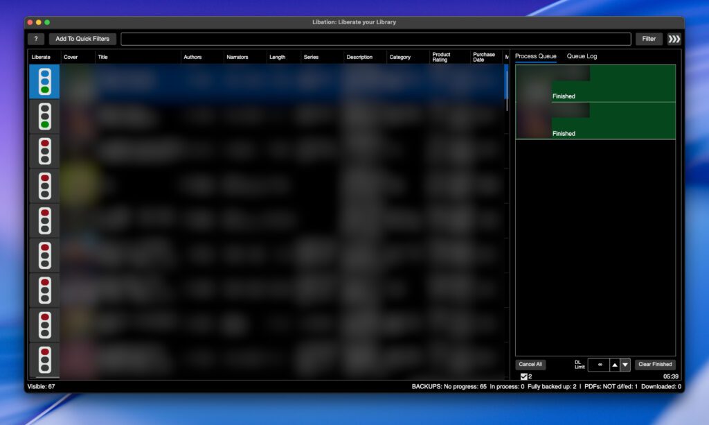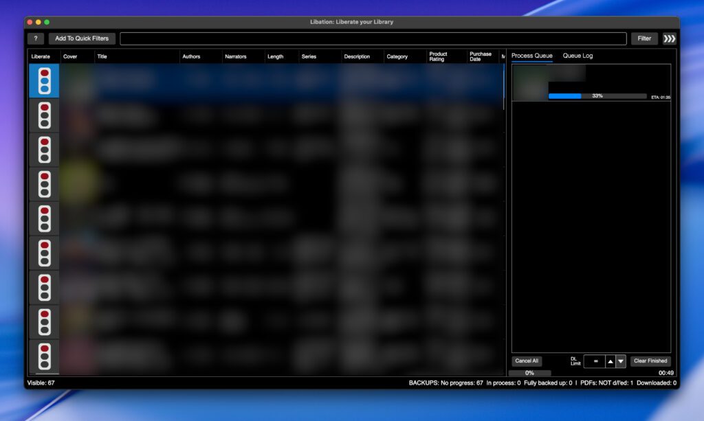 Um ein Audible Hörbuch als MP3 oder M4B herunter zu laden, klickt man einfach auf die Ampel links neben dem Hörbucheintrag. Dann wird der Titel rechts in die Downloadliste gesetzt. Die Liste wird nach und nach abgearbeitet, es gibt keine parallelen Downloads, die sich gegenseitig ausbremsen. So arbeitet Libation ziemlich schnell und die Hörbücher sind in relativ kurzer Zeit gesichert.