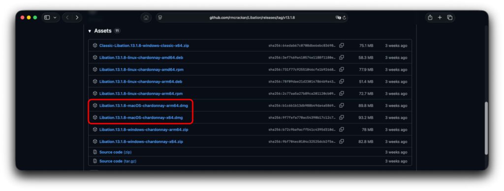 Dort klickt man rechts auf „Releases“ und wählt auf der folgenden Seite das passende Paket aus. Für macOS sind es .dmg-Dateien – jene mit x64 im Namen für Macs mit Intel-Prozessoren, jene mit arm64 im Namen für Apple Silicon Macs.
