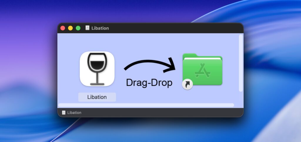 Nach dem Öffnen der .dmg-Datei zieht man Libation in den Programme-Ordner, um die Software zu installieren. Danach kann das gemountete dmg-Laufwerk wieder ausgeworfen werden.