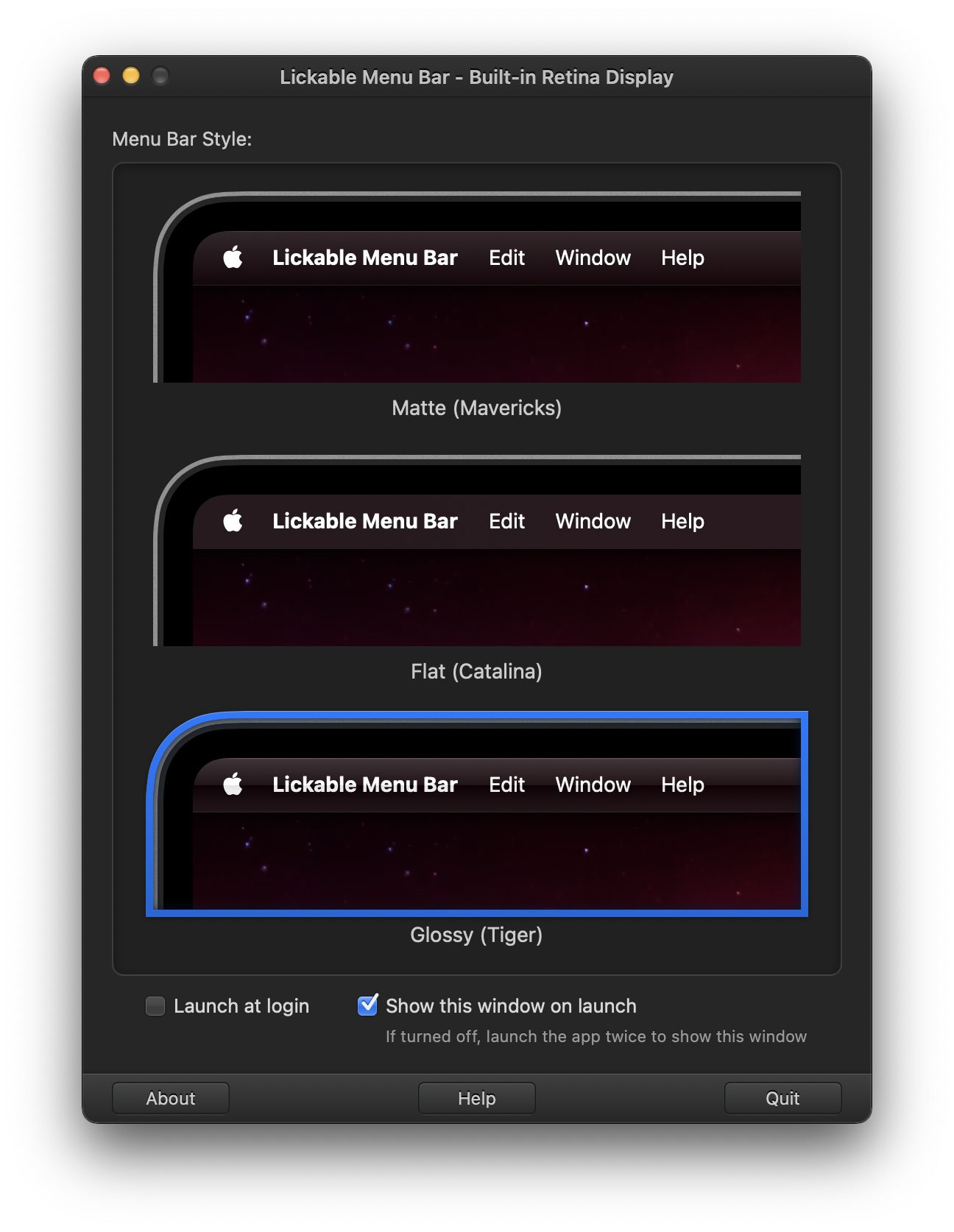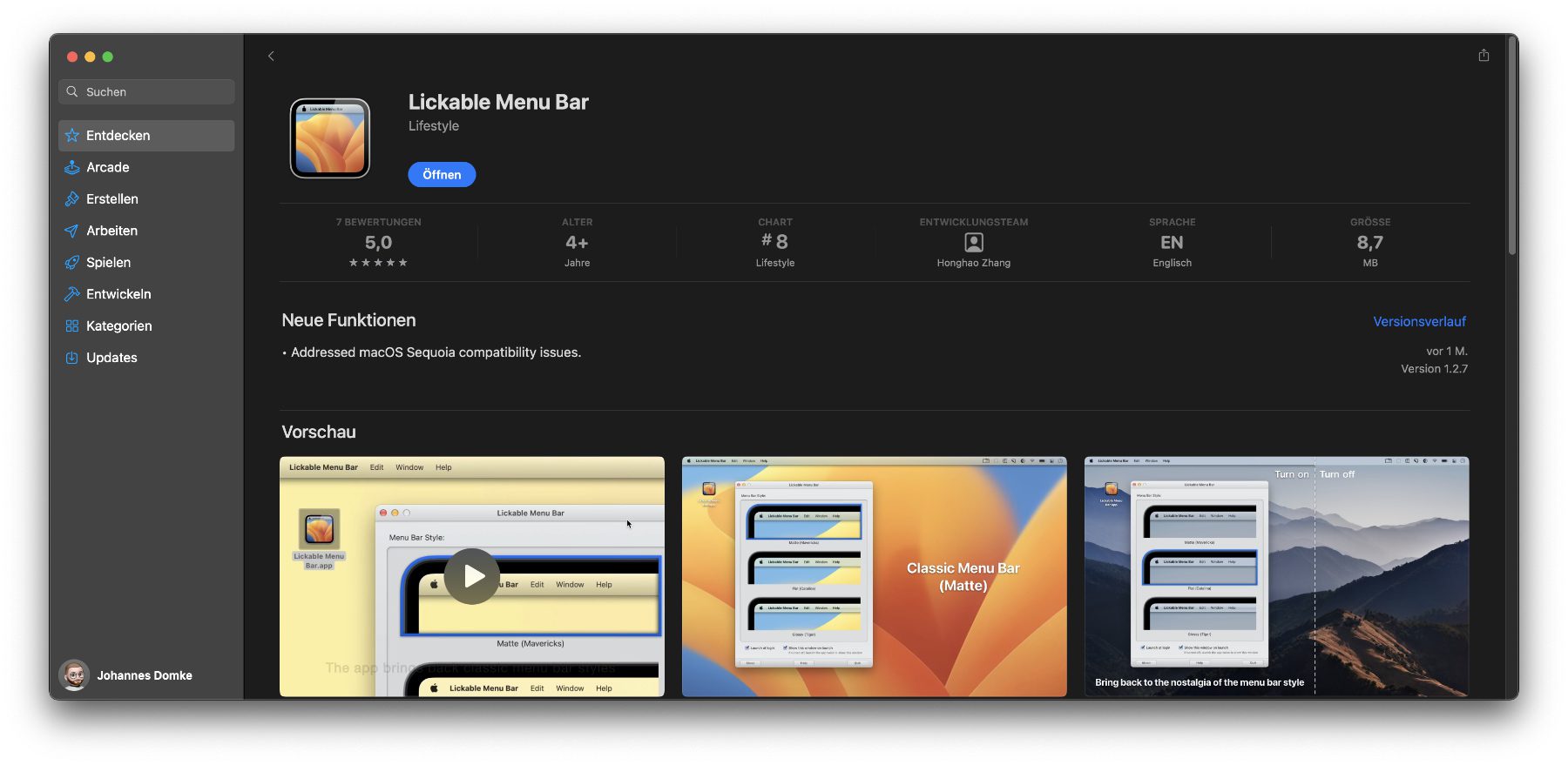 Aber zurück zur Lickable Menu Bar App. Diese ist ebenfalls gratis im Mac App Store verfügbar und bringt drei Optionen für die Anpassung des Menüleisten-Designs mit. Diese erinnern an vergangene macOS-, OS X- bzw. Mac OS X-Versionen. Die möglichen Einstellungen sind: Matte (Mavericks), Flat (Catalina) und Glossy (Tiger). Die Namen in Klammern sind Bezeichnungen von Mac-Betriebssystemen: OS X 10.9 Mavericks, macOS 10.15 Catalina und Mac OS X 10.4 Tiger.