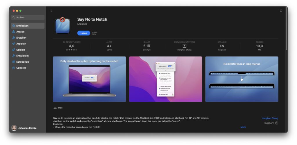 Die Lickable Menu Bar App stammt vom Entwickler Honghao Zhang, der noch weitere Mac-, iPhone und iPad-Apps im Angebot hat. Zum Beispiel sorgt seine App „Say No to Notch“ dafür, dass am oberen Rand von MacBook-Displays ein schwarzer Balken angezeigt wird. Dank diesem wird die Menüleiste darunter dargestellt, also auch unter der Notch. Selbige teilt die Menüleiste dann nicht mehr.