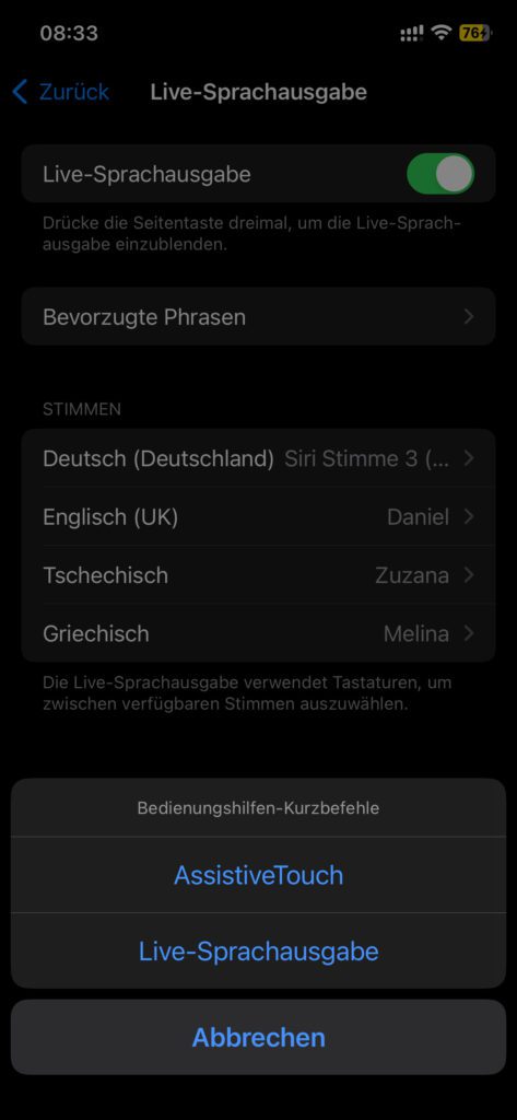 Hinweis: Falls ihr dem dreimaligen Betätigen der Seitentaste noch eine andere Funktion zugewiesen habt, dann erscheint erst einmal eine Auswahl der verfügbaren Optionen. Bei mir ist z. B. noch AssistiveTouch aus der „Virtueller Home-Button“-Anleitung eingestellt. Deshalb führt das dreimalige Drücken der Seitentaste zu folgender Übersicht, aus der ich dann die Live-Sprachausgabe auswählen muss: