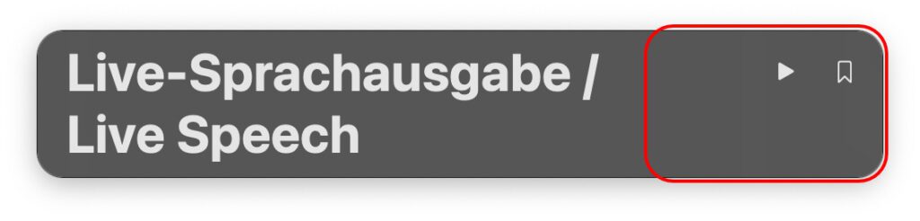 Um die gesicherten Texte über die Lautsprecher, in Telefonaten oder füre die verbundenen Kontakte hörbar in einem FaceTime-Telefonat sprechen zu lassen, klickt ihr im Live Speech Eingabefeld rechts das Lesezeichen-Symbol an. Dann wählt ihr den gewünschten Satz aus und klickt auf Play / die Eingabetaste. Wollt ihr dem ausgewählten Text noch etwas hinzufügen, ist das möglich. Klickt ihn an, tippt die Ergänzung ein, und wählt dann erst das Play-Symbol. Statt diesem könnt ihr auch hier die Eingabetaste (Enter) betätigen.