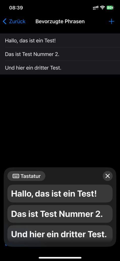 Habt ihr einen Text in das Eingabefeld getippt, dann könnt ihr ihn mit dem „Senden“-Button rechts unten wiedergeben lassen. Jede einzelne Reaktion in einem Gespräch oder jeden Satz einer Präsentation live einzutippen, das ist auf Dauer aber ermüdend. Für häufige Phrasen, bestimmte Floskeln oder einen Vortrag können einzelne Textabschnitte deshalb abgespeichert und bei Bedarf ausgewählt werden.