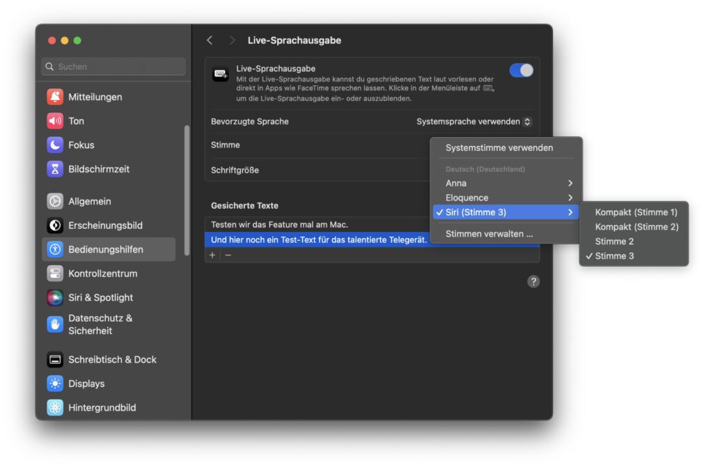 Ein Problem, dass ich weder durch Herumprobieren noch durch einen Neustart gelöst bekommen habe, ist die Festlegung der Stimme. Obwohl ich anstelle der Systemstimme verschiedene Siri-Varianten und andere Stimmen eingestellt habe, wurde immer nur die Systemstimme für die Sprachausgabe genutzt. Entweder ist das ein Bug, der mit einem Systemupdate von macOS 14 behoben wird, oder ich habe hier etwas übersehen.