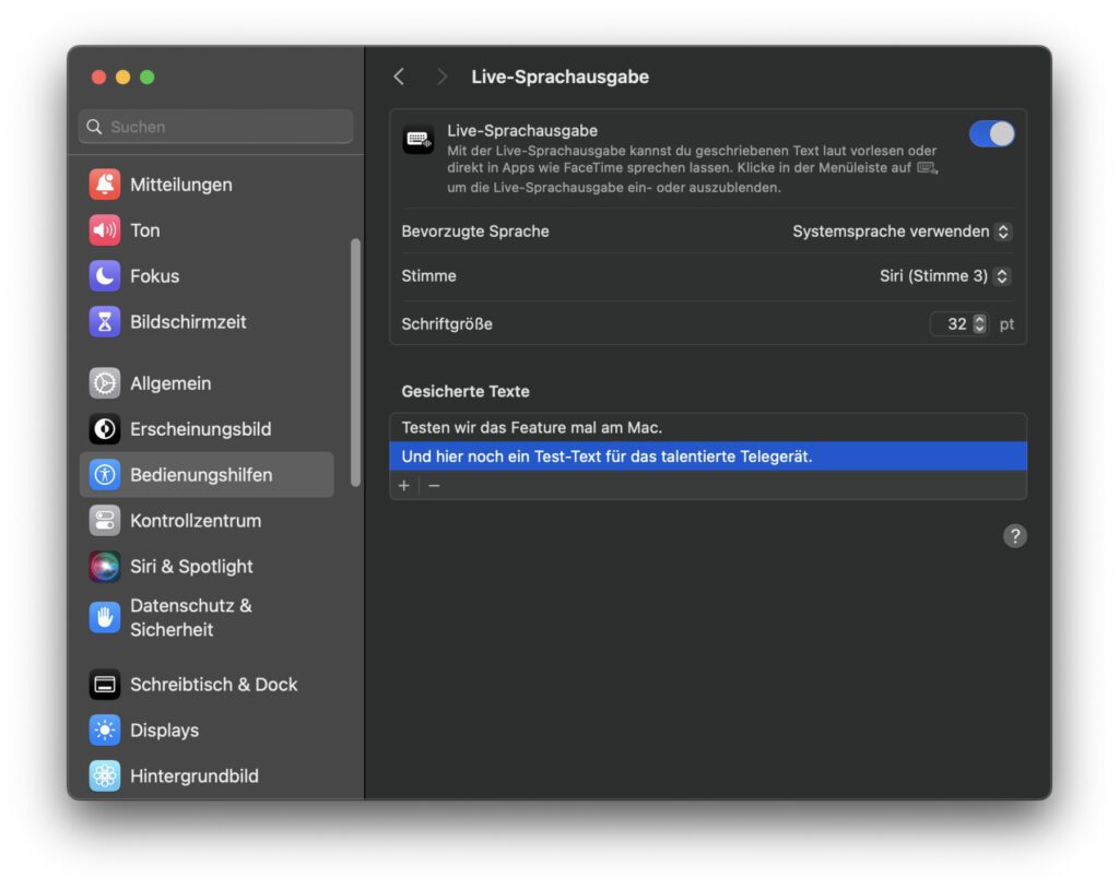 Um die Computer-Sprachausgabe am Apple Mac, iMac, MacBook und dergleichen mit Apple-Chip (M1, M2, etc.) ab macOS Sonoma über die Lautsprecher des Computers oder für alle Teilnehmenden hörbar in einem Telefonat bzw. FaceTime-Anruf zu nutzen, geht es auch hier in die Einstellungen des Systems hinein. Hier lassen sich ebenfalls einige Einstellungen vornehmen sowie häufig verwendete Phrasen für die spätere Nutzung hinterlegen.