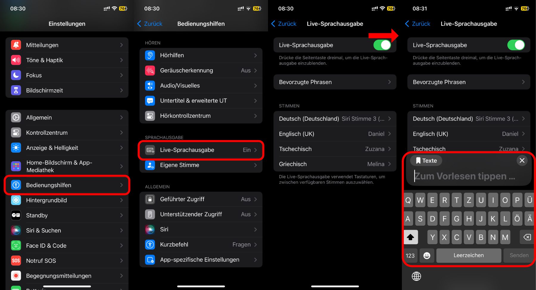 - Ruft wieder Einstellungen -> Bedienungshilfen -> Live-Sprachausgabe auf
