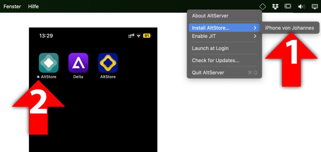 Am Apple Mac öffnet ihr die AltServer App, sodass ihr sie über die Menüleiste nutzen könnt. Klickt das Menüleistensymbol an, führt den Mauscursor auf Install AltStore… und wählt dann in dem Menü dieses Punktes euer iPhone aus. Anschließend müsst ihr euren Apple-ID-Login eingeben.