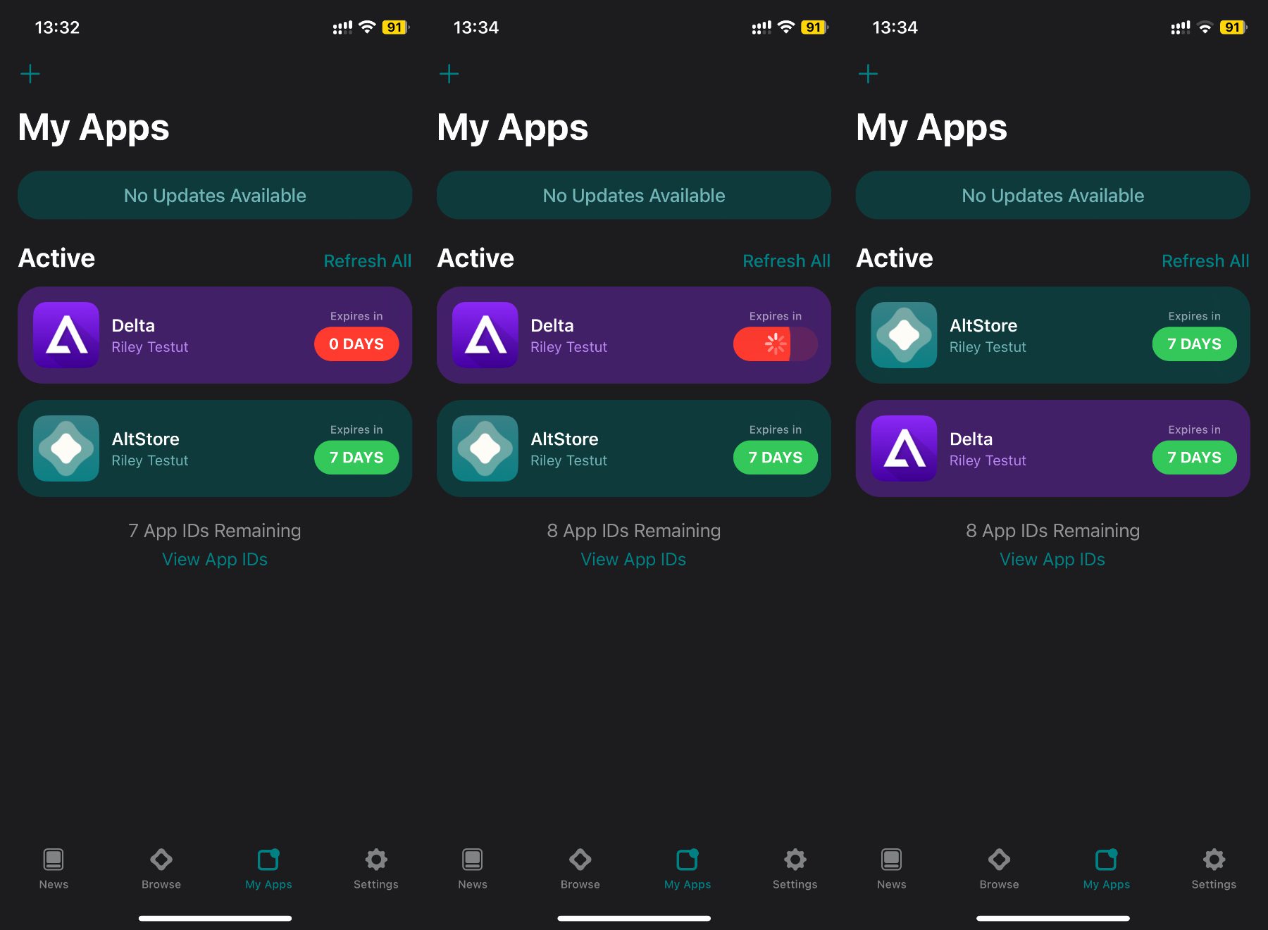 Öffnet dann die AltStore App und tippt den Tab My Apps an. Dort steht in der Delta-Zeile wahrscheinlich „Expires in 0 Days“. Tippt einfach auf den roten „0 Days“-Button und wartet die Aktualisierung der App an. Ist der Button wieder grün und zeigt „7 Days“ an, könnt ihr Delta wieder nutzen.