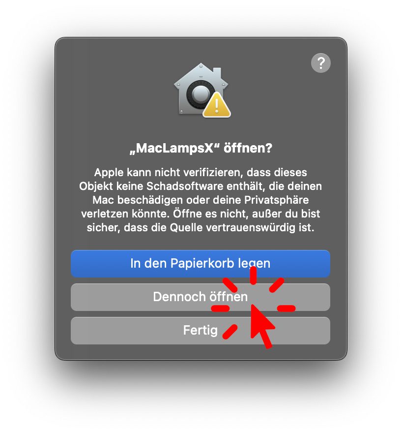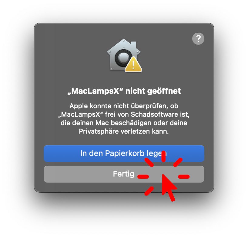 - Die Warnmeldung des Mac mit einem Klick auf „Fertig“ schließen