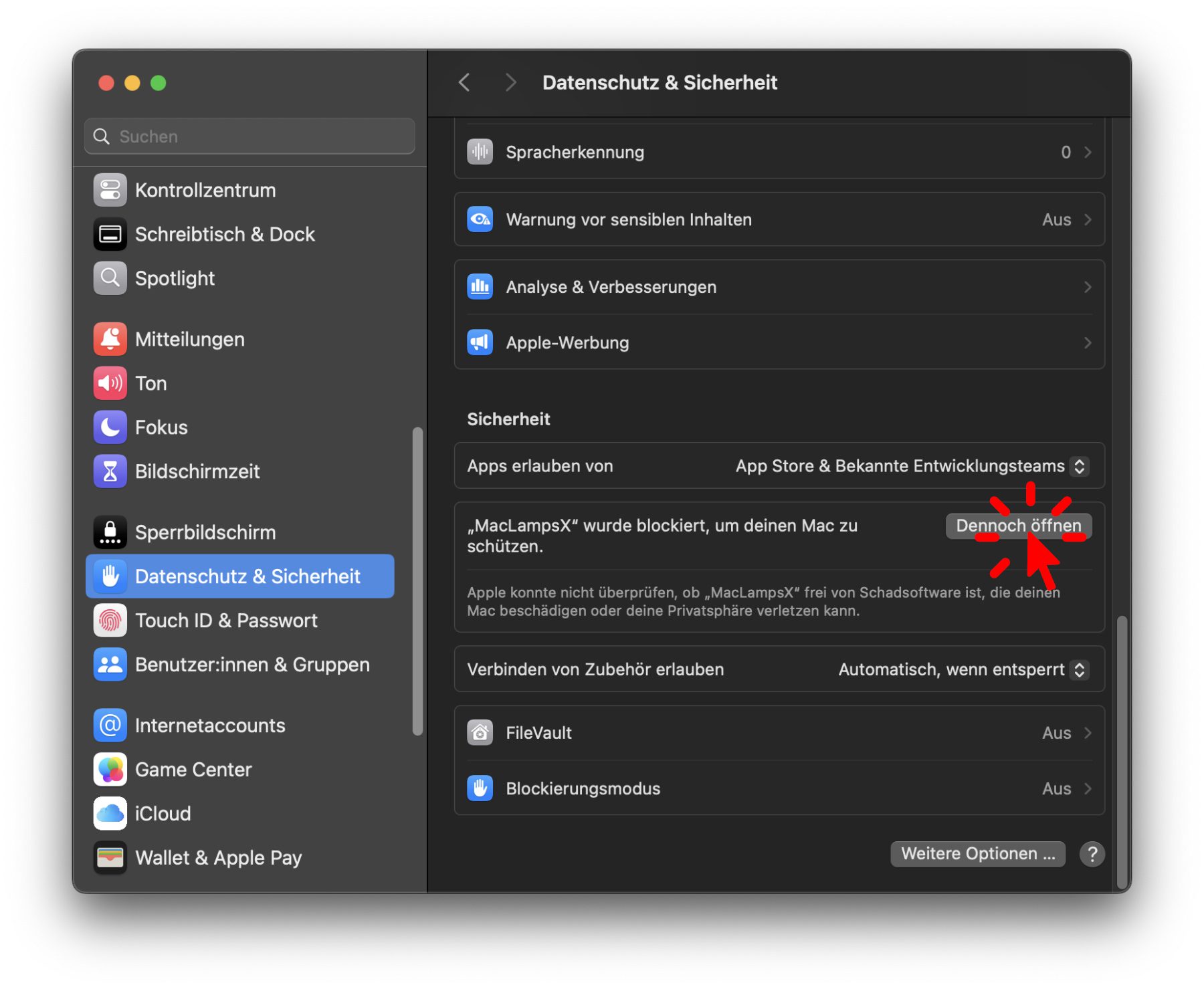 - Unter Systemeinstellungen -> Datenschutz & Sicherheit im Bereich „Sicherheit“ auf den „Dennoch öffnen“-Button klicken