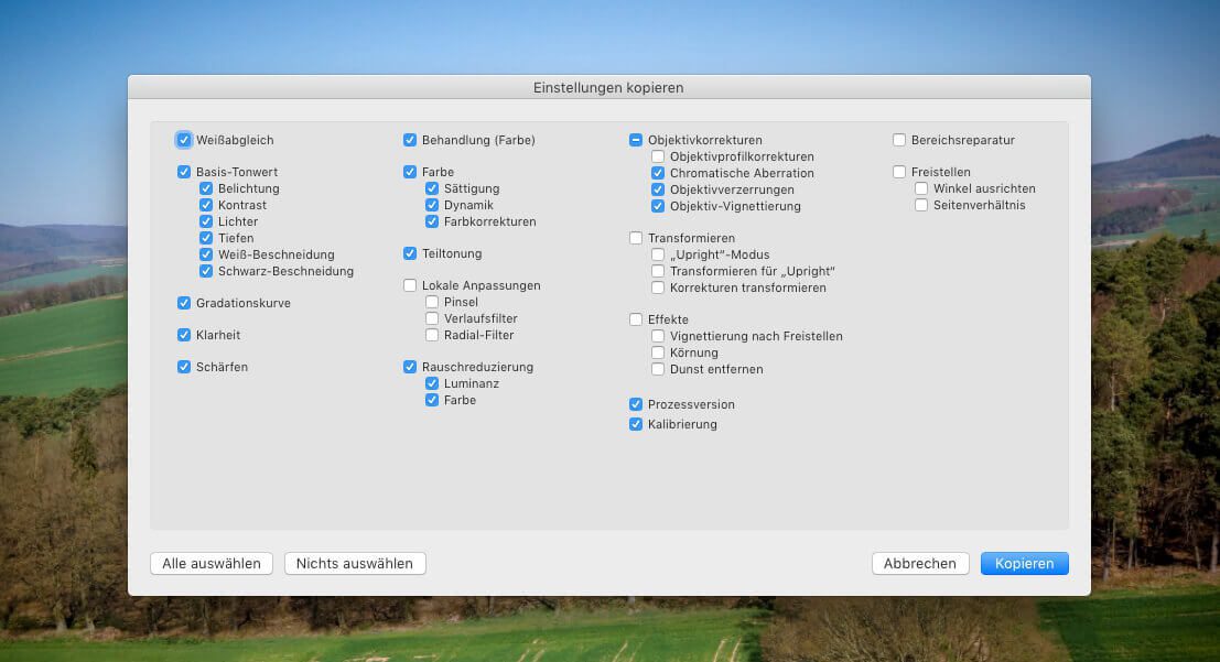 Die beiden Buttons Copy und Paste sind auf den ersten Blick auch hilfreich, da man damit die Entwicklungseinstellungen von einem Foto auf ein anderes kopieren lassen, aber hier ist ein bisschen Vorsicht geboten.