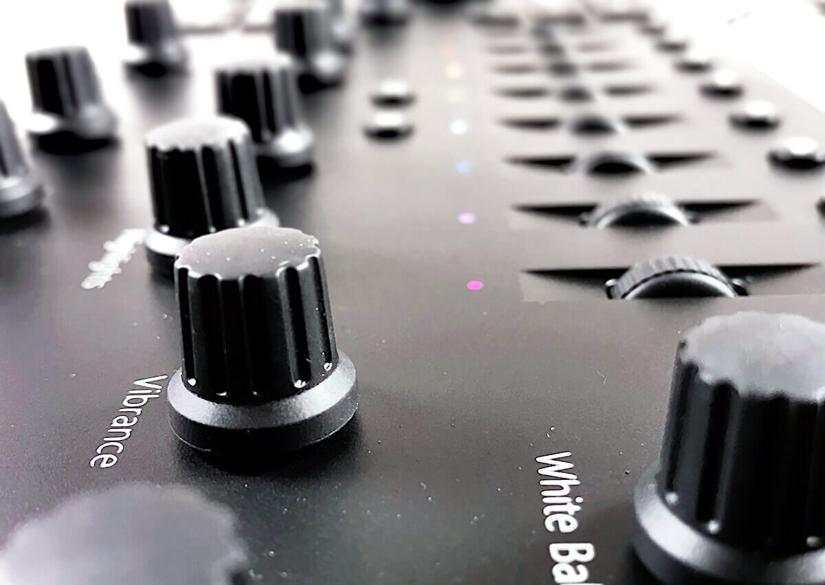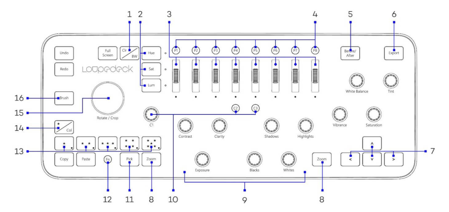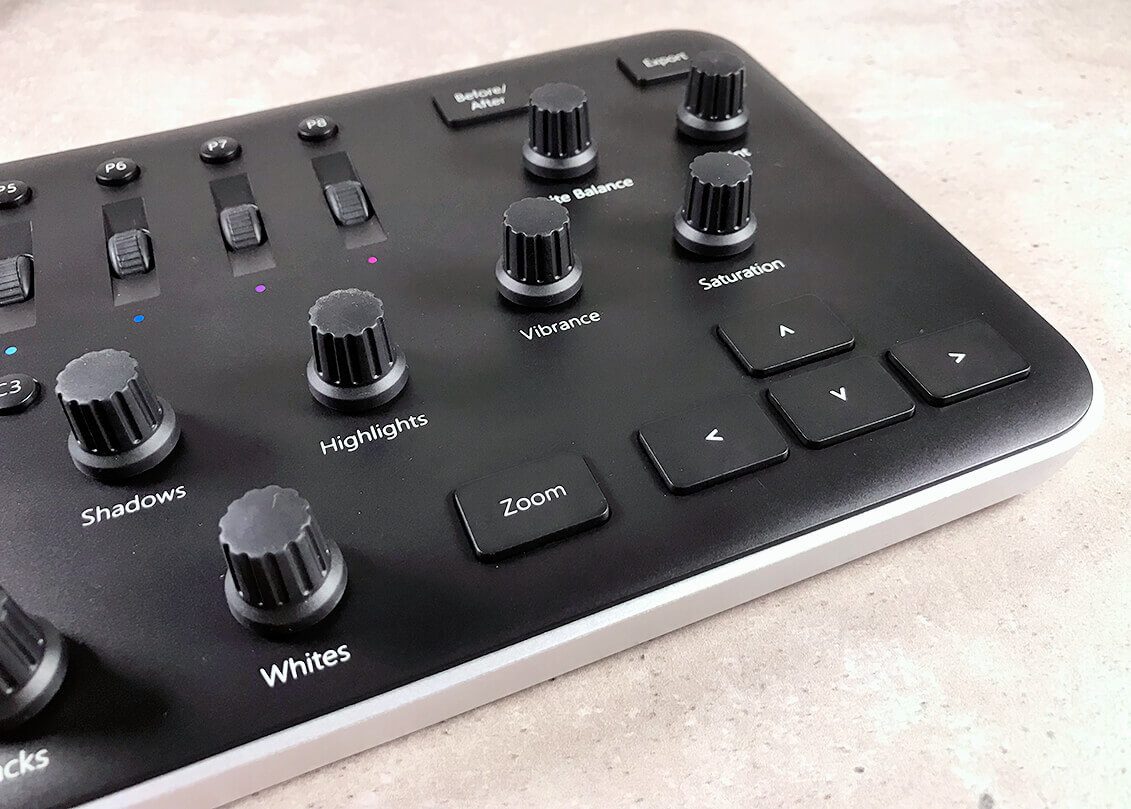 Drehregler, die auch eine Tasterfunktion haben, gibt es für Regler C1 (frei definierbar), Contrast, Clarity, Exposure, Shadows, Highlights, Blacks, Whites, White Balance, Tint, Vibrance, Saturation. Alle diese Regler kann man auch drücken, um die Einstellung des entsprechenden Reglers wieder auf Null zu setzen.