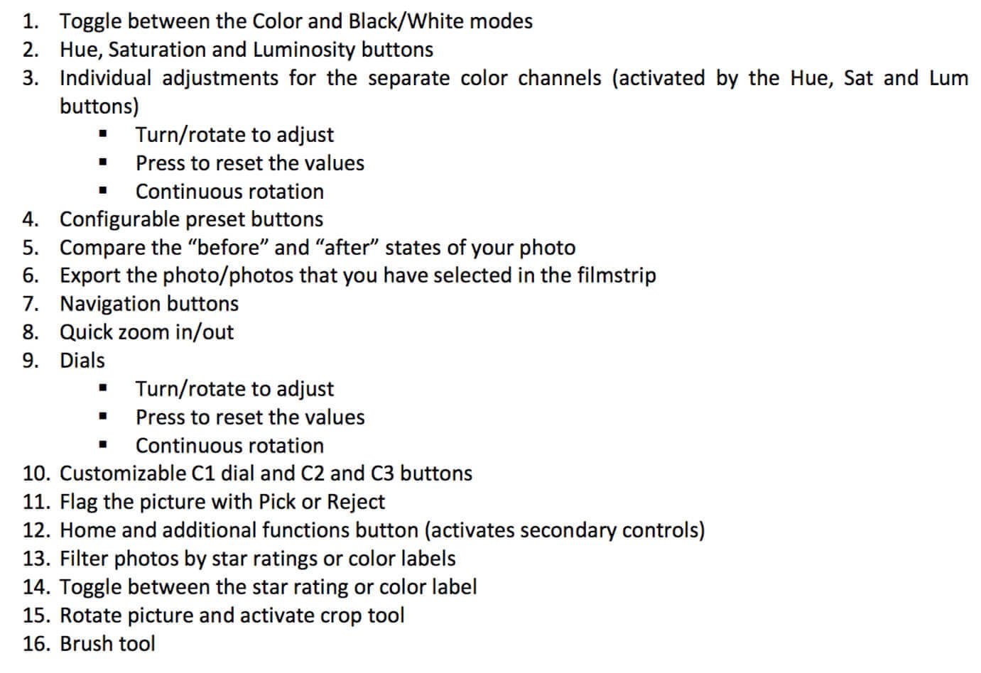 Taster gibt es für Undo, Reno, Brush, Umschalten zwischen Sternebewertung/Farbe, Bewertungssternchen (1-5 Sterne) bzw. Farbe, Copy, Paste, Pick, Zoom, Fullscreen, Color/Black-White, Hue, Saturation, Luminance, Before/After, Export sowie Cursortasten (hoch, runter, links, rechts).