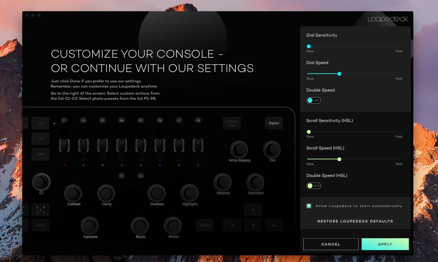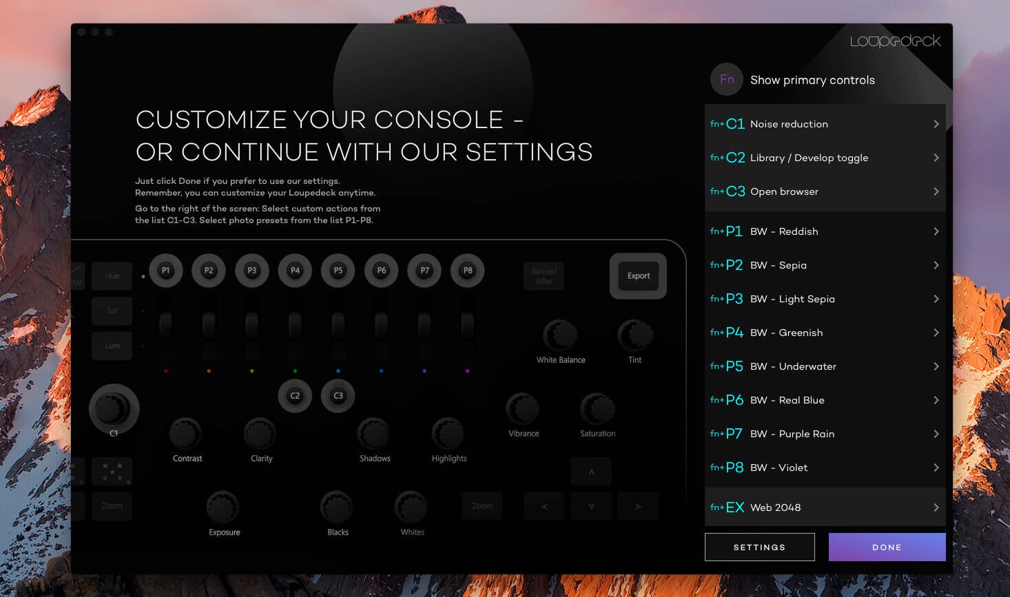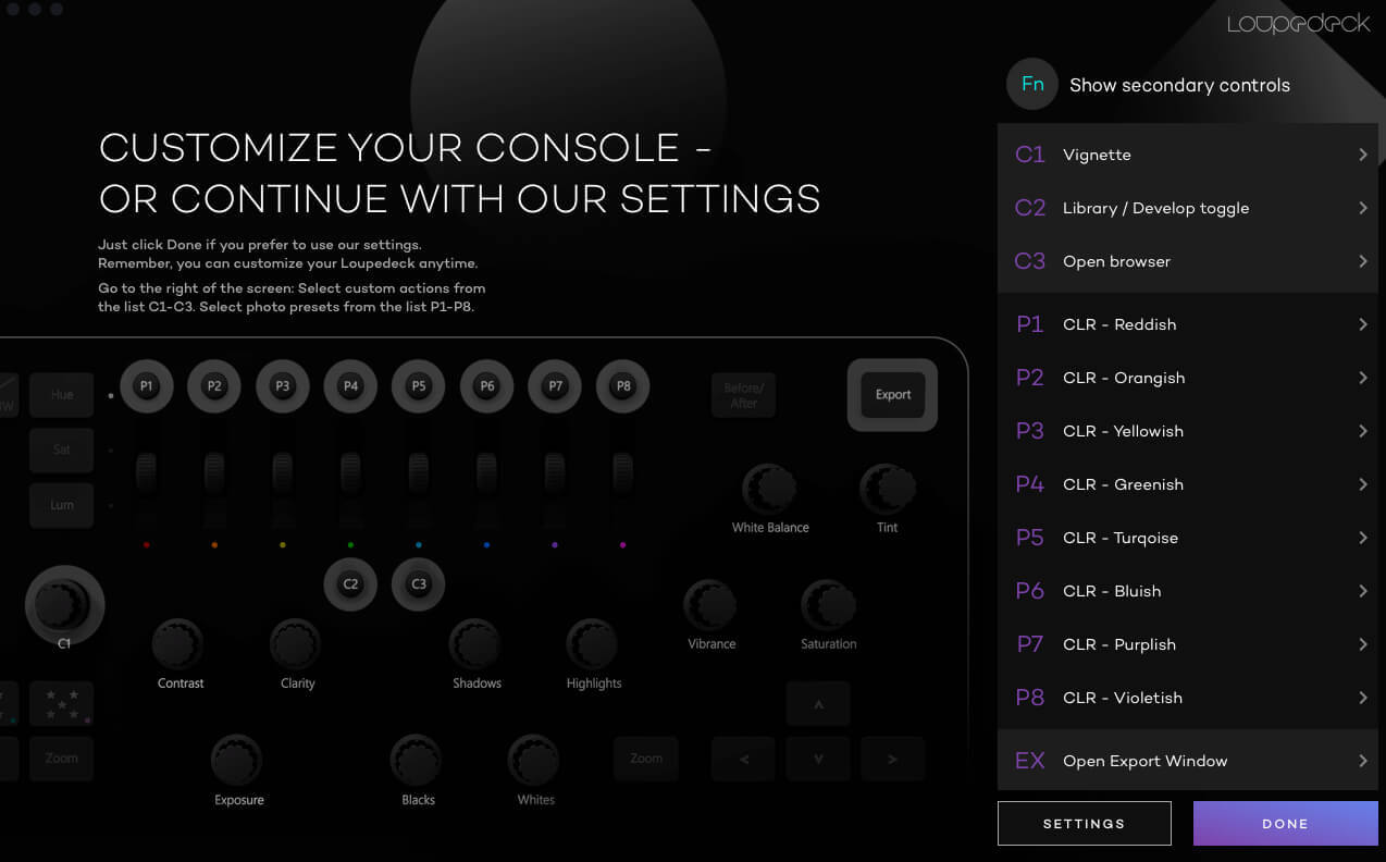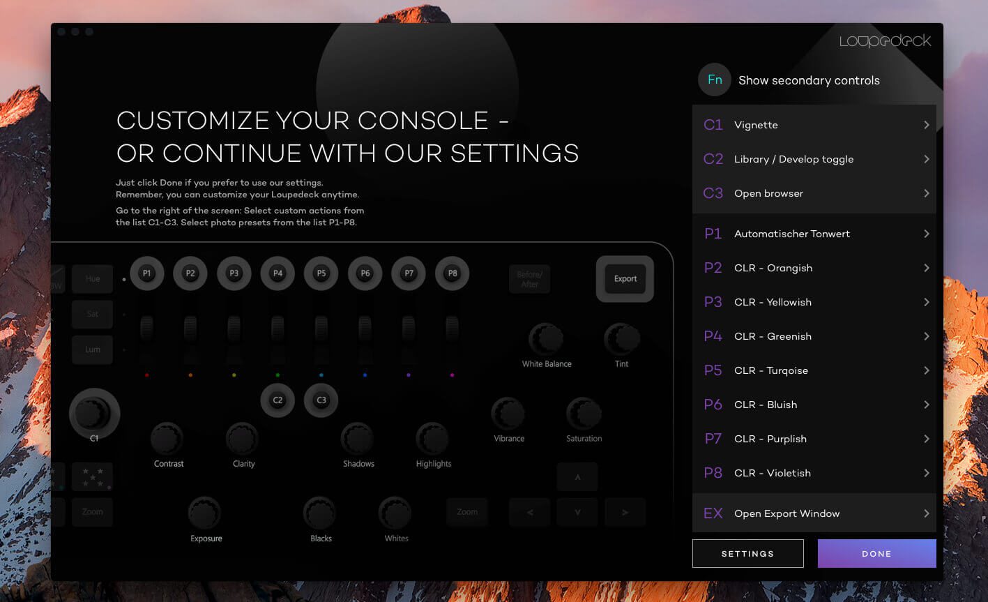 Wenn man nun die App startet, wird man (nur beim ersten Start) durch einen Assistenten geführt, der Lightroom mit aufruft und in wenigen Schritten die Einstellungen von Loupedeck aufzeigt. Im Grunde muss man hier nichts machen, denn die Standard-Belegung ist schon durchdacht und dürfte für die meisten Leute passen.