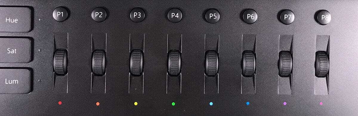 Im oberen Bereich sind noch weitere Scrollräder, die für die einzelnen Farbbereiche zuständig sind. Diese kann man nutzen, wenn man detaillierte Farbkorrekturen ausführen möchte. Über die daneben liegenden Buttons kann man die Reiter „Hue“, „Saturation“ oder „Luminance“ auswählen, in denen die Farbkorrekturen stattfinden sollen.