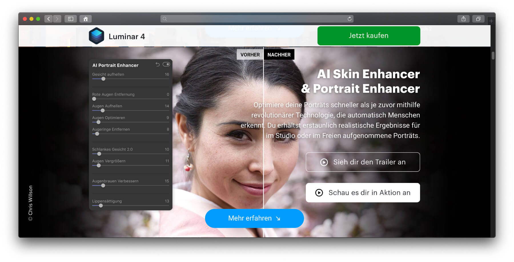 Skylum Luminar 4 ist eine Software, die ihr als Standalone-App oder als Plugin in Apple Fotos, Adobe Photoshop, Adobe Lightroom oder auch Adobe Photoshop Elements nutzen könnt. Die Software für die Fotobearbeitung unterstützt RAW-Formate und enthält zahlreiche KI-gestützte sowie weitere smarte Funktionen. Dabei sind zum Beispiel das AI Sky Replacement, das nicht nur ohne pfriemeliges Maskieren den Himmel austauscht, sondern die gesamte Bildstimmung daran anpasst – natürlich mit der Möglichkeit zur individuellen Anpassung. Weiterhin sind Hilfen für Portraits, für Haut-Verbesserungen, das AI Augmented Sky Tool, Sonnenstrahlen und Filter enthalten. Neben den voreingestellten Werkzeugen und Anpassungen lässt sich natürlich alles auch ganz individuell verbessern, anpassen und ändern.