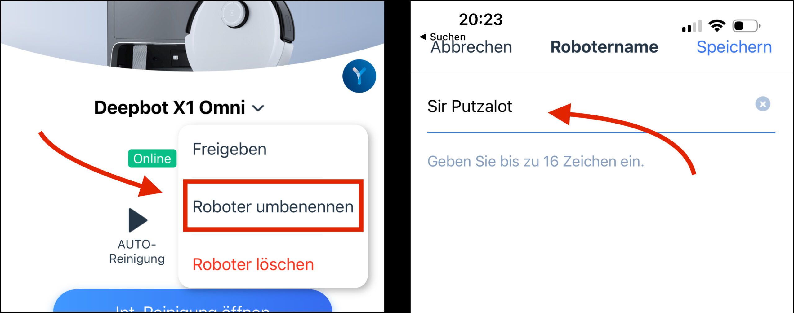 Bevor man nun dauernd mit einem kryptischen Namen wie "X1 Omni" oder "Roborock S6 Plus" werkeln muss, kann man dem Roboter doch einen lustigen Namen geben, der einem in Zukunft ein Lächeln ins Gesicht zaubert, wenn man in der App ein Kommando an den Sauger absetzen möchte.