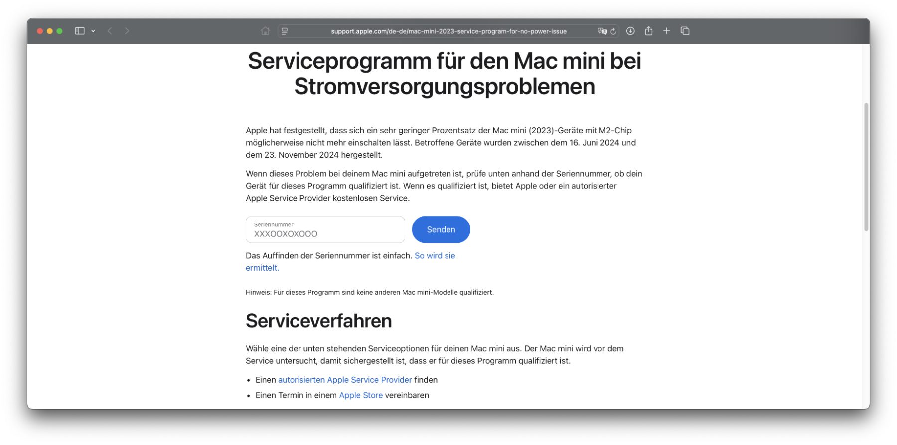Apple hat kürzlich das „Serviceprogramm für den Mac mini bei Stromversorgungsproblemen“ gestartet. Dieses gilt für den Mac mini mit M2-Chip, der 2023 auf den Markt gebracht wurde. Davon soll es weltweit Modelle geben, die sich möglicherweise nicht mehr einschalten lassen. Betroffen sollen Geräte sein, die von Juni bis November 2024 hergestellt wurden. Ob der eigene M2 Mac mini für das Reparaturprogramm qualifiziert ist, kann man anhand der Seriennummer auf dieser Sonderseite von Apple prüfen.