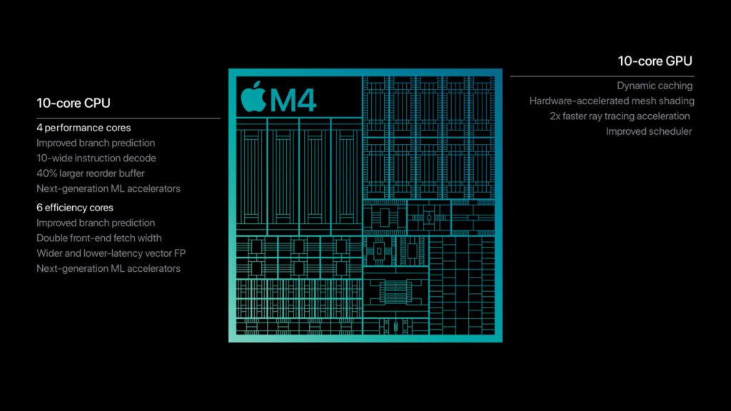 „Für Unternehmer:innen, Studierende, Creator:innen und mehr kommt die phänomenale Performance des M4 zum ersten Mal auf den Mac […] Er ist bis zu 1,8-mal schneller als der M1, sodass Multitasking in Apps wie Safari und Excel ultraschnell wird. Eine 10‑Core GPU liefert eine unglaubliche Grafikperformance – sie ist bis zu doppelt so schnell als beim M1 und macht alles von Fotobearbeitung bis AAA Gameplay außergewöhnlich schnell und flüssig“, heißt es von Apple zum M4.