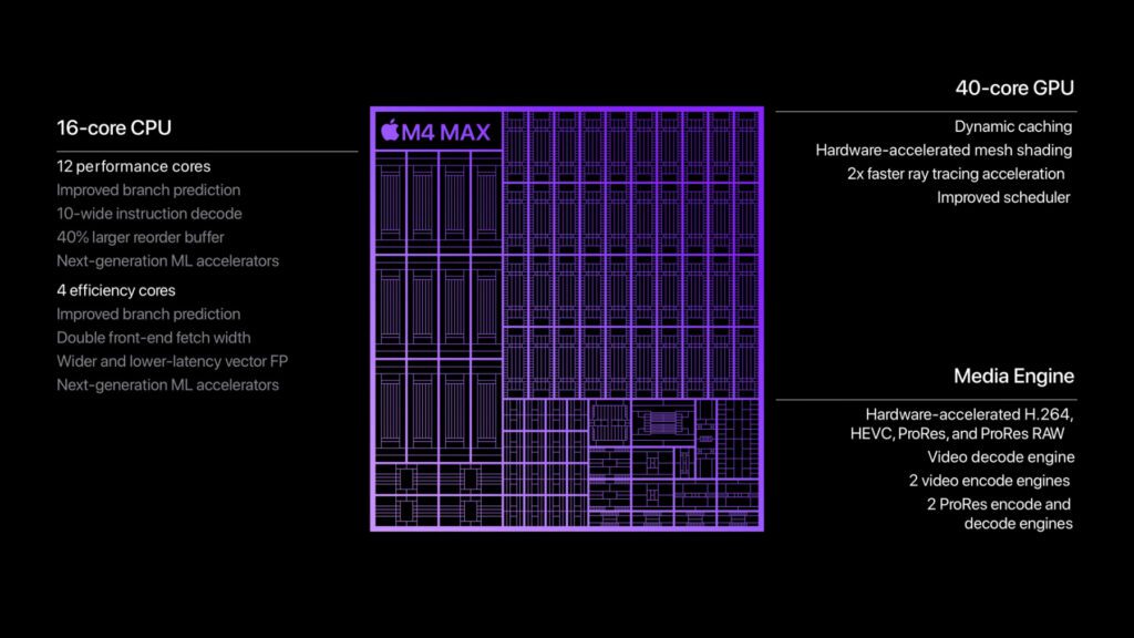 „Der M4 Max ist die ultimative Wahl für Datenwissenschaftler:innen, 3D Künstler:innen und Komponist:innen, die mit ihren Pro Workflows ständig ans Limit gehen […] [Die CPU] ist bis zu 2,2-mal schneller als die CPU im M1 Max und bis zu 2,5-mal schneller als beim neuesten KI PC-Chip. Die GPU hat bis zu 40 Kerne für eine Performance, die bis zu 1,9-mal schneller ist als beim M1 Max und bis zu erstaunliche viermal schneller als beim neuesten KI PC-Chip. Hohe Workloads wie Rauschreduzierung bei Rohmaterial in DaVinci Resolve Studio werden so in Echtzeit ausgeführt“, heißt es von Apple zum M4 Max.