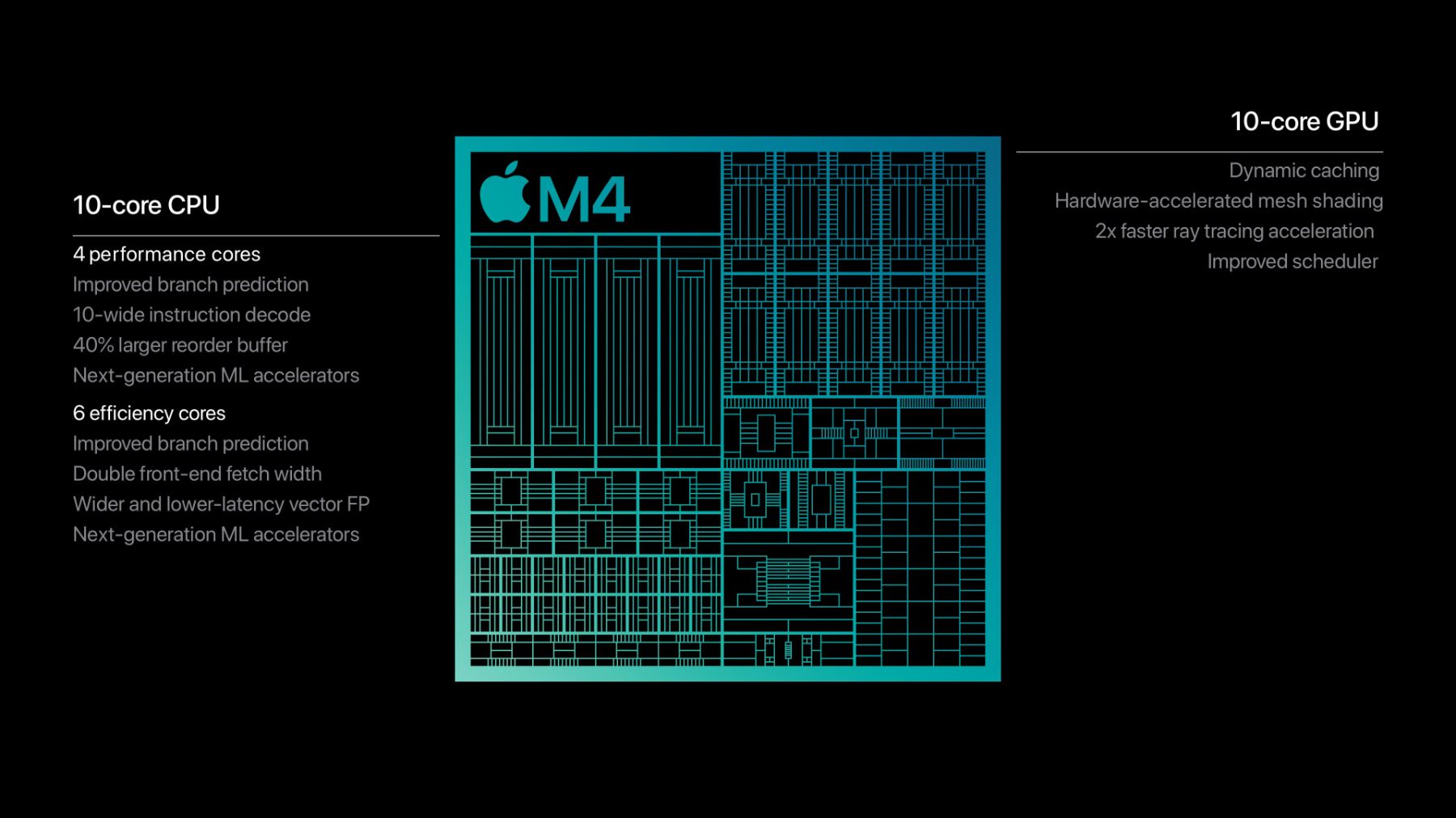 - 10-Core GPU mit Dynamic Caching (wurde mit dem M3 eingeführt), hardwarebeschleunigtem Mesh-Shading, schnellerem Raytracing, etc.