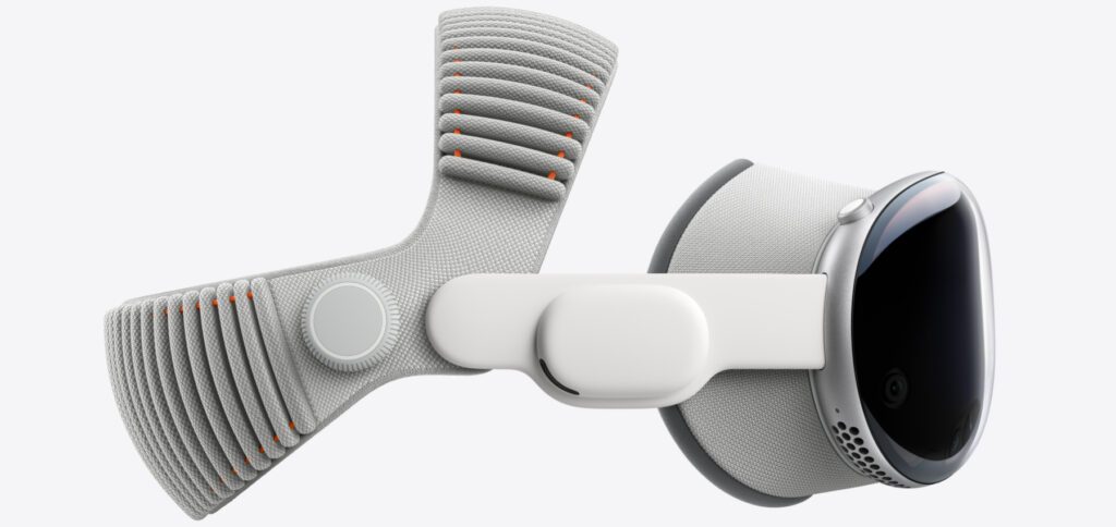 Anstelle des einfachen Strickgewebe-Bands der ersten Generation, das lediglich um den Hinterkopf verlief, ist die zweite Generation von Apples VR-Brille nun mit einem Doppel-Halteband ausgestattet. Das „Dual Band aus Strickgewebe“ verläuft zusätzlich über den Kopf und lässt sich über ein Drehrad enger stellen. Damit entfällt die Installation eines zusätzlichen Bands und die Vision Pro sollte bereits in der Standardausführung angenehmer zu tragen sein.