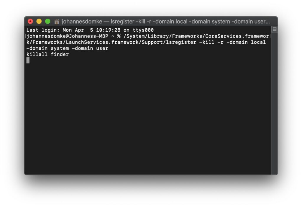 /System/Library/Frameworks/CoreServices.framework/Frameworks/LaunchServices.framework/Support/lsregister -kill -r -domain local -domain system -domain user - Gebt dann diesen Befehl ein und bestätigt ihn mit Enter: