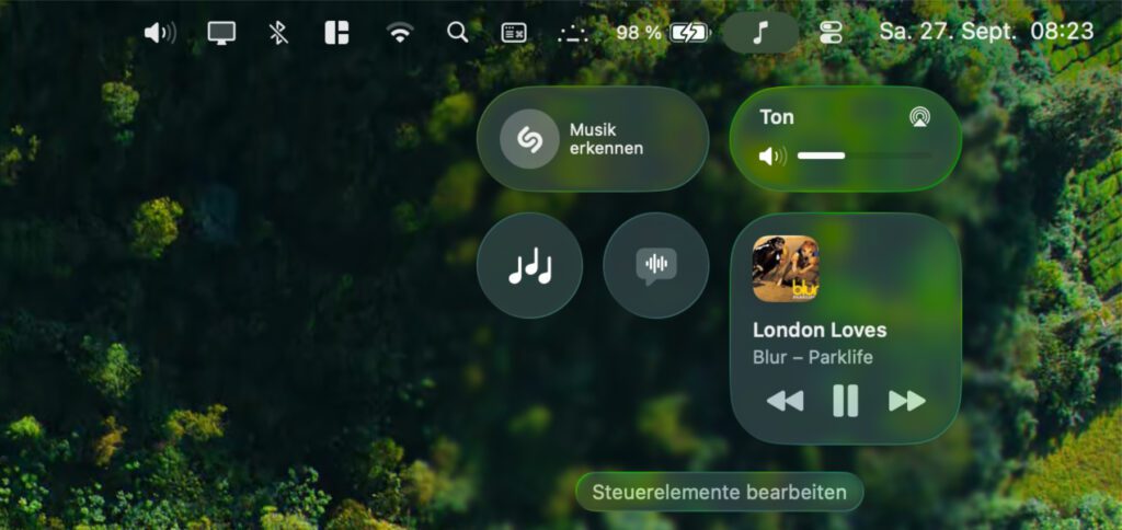 Durch diese neue Kontrollzentrum-Option zum Einrichten eigener Menüleistensteuerung-Übersichten ist es möglich, die oft genutzten Einstellungen und Optionen schneller zu finden. Ich habe im obigen Beispiel ein Audio-Menü erstellt, mit dem ich die Lautstärke anpassen, Shazam aktivieren, Hintergrundgeräusche auswählen und auch die aktuelle Wiedergabe einsehen kann.