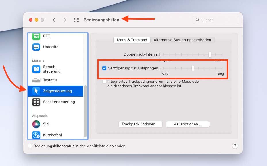 Aufspringende Ordner de-/aktiveren und Verzögerung ändern