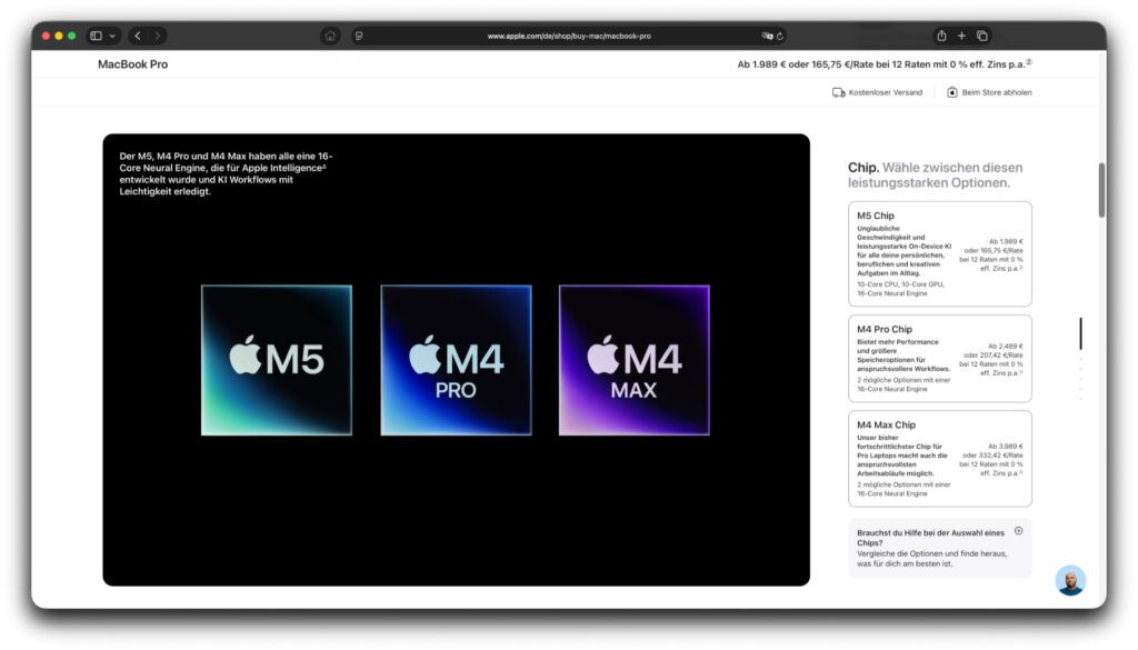 Nehmen wir mal das Beispiel MacBook Pro. Auf der Apple Bestellseite gab es vorher die Auswahl der Displaygröße und des gewünschten M-Chips. Aus einer Auswahl von vorkonfigurierten Maschinen konnte man bisher das passende auswählen und dann auf der Produktseite den letzten Feinschliff vornehmen.