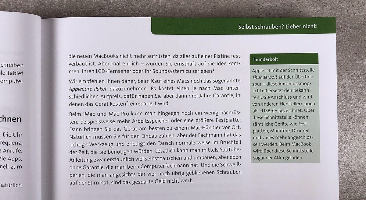 Ebenfalls erwähnt wird das iPad bzw. iPad Pro und wie es als Computerersatz fungieren kann. Geräte wie das iPhone und die Apple Watch werden an dieser Stelle ebenfalls erwähnt, weil die Zusammenarbeit mit dem Mac in späteren Kapiteln eine Rolle spielt. In kleinen Info-Kästchen wird in diesem großen Artikel "Welcher Mac darf es denn sein?" auch auf SSD-Festplatten, Retina-Display und Thunderbolt eingegangen. Natürlich bekommt man hier keine seitenlange Ausführung, die tiefergehend über diese Begriffe informieren, aber es wird kurz erwähnt, was es damit auf sich hat. Damit ist für einen totalen Apple-Neuling eigentlich auch genug gesagt.