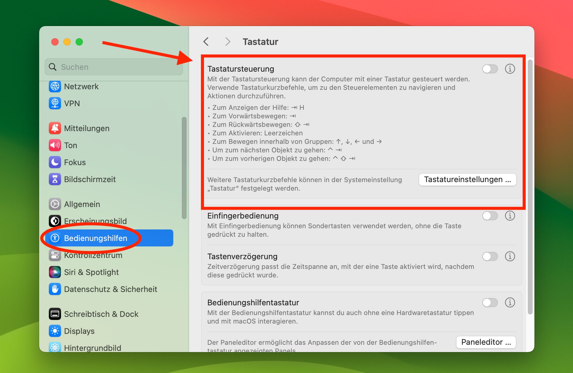 Systemeinstellungen → Bedienungshilfen → Tastatur (unter „Motorik“) → Tastatursteuerung