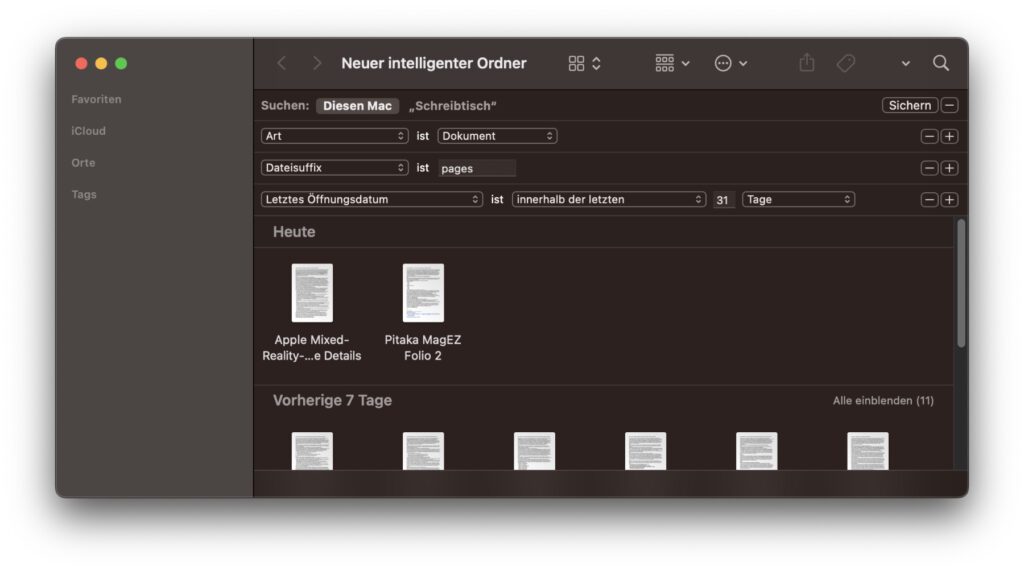 Ihr könnt also nicht nur ganz einfache Datei-Suchen in einem intelligenten Ordner speichern, sondern darüber hinaus sehr spezielle und fachspezifische Suchanfragen. Von der Fotobearbeitung, der Video- und Musikproduktion hin zu wissenschaftlichen Auswertungen oder der Ordnung von Steuerunterlagen ist also so ziemlich alles mit den intelligenten Ordnern am Mac machbar. Mit mehreren intelligenten Ordnern im gleichen Verzeichnis könnt ihr Dateien verschiedener Zeiträume, Größen, Abmessungen und weiteren Eigenschaften automatisch ordnen lassen und immer von einem zentralen Ort aus aufrufen.