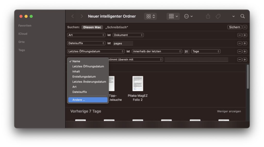 Neben dem Suchfeld oben rechts im Finder-Fenster, das automatisch nach dem Anlegen des Ordners ausgewählt sein sollt, nutzt ihr für die genauen Suchparameter das Plus-Symbol (+) darunter. Klickt auf das Plus und legt zum Beispiel für „Art“ Beliebig, Dokument, Musik, PDF, Text oder eine andere Dateiart fest. Klickt ihr abermals auf das Plus, fügt ihr noch weitere Suchkriterien (oder „Regeln“, wie Apple es nennt) hinzu: Name, Letztes Öffnungsdatum, Inhalt, Erstellungsdatum, Letztes Änderungsdatum, etc. Klickt auf Andere…, um auf eine riesige Liste weiterer Parameter zuzugreifen.