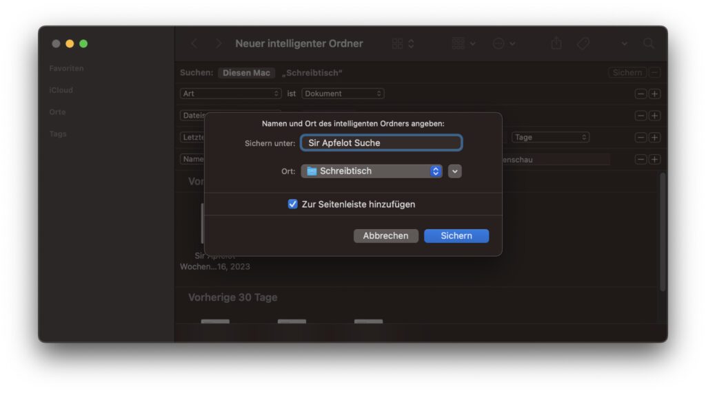 Ich habe meinen Beispielordner mal „Sir Apfelot Suche“ genannt, da er nach den wöchentlich erscheinenden Wochenschau-Artikeln sucht. Es lässt sich sogar einstellen, ob der Ordner in der Seitenleiste des Finder-Fensters abgelegt werden soll, was bei einem schnellen Aufrufen und Suchen hilft. Ihr könnt ihn aber auch auf dem Schreibtisch oder in einem anderen Ordner ablegen, den ihr sowieso öfter aufruft und von dem aus ihr ebenfalls einen schnellen Zugriff auf eure gespeicherte Suche bekommt.