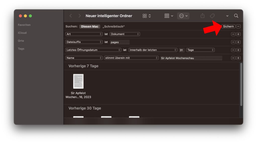 Anders als bei regulären Ordnern, die nach dem Anlegen direkt verfügbar und nutzbar sind, muss ein intelligenter Ordner mit den eingestellten Suchparametern bzw. Suche-Regeln erst einmal gespeichert werden. Das geht allerdings ganz schnell, indem ihr oben rechts unter dem Suche-Symbol (Lupe) auf Sichern klickt. Wenn ihr auf den Sichern-Button klickt, dann werdet ihr nach dem gewünschten Namen für den Ordner sowie nach seinem Ablageort gefragt.