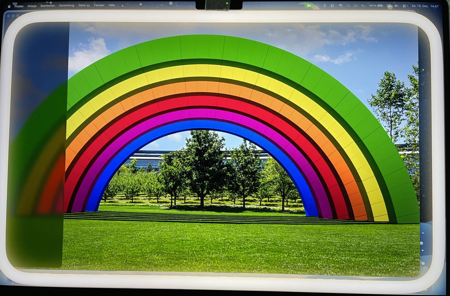 Das virtuelle Ringlicht des Mac wird dann an dieser Stelle durchsichtig. Man muss also nicht immer wieder das Kantenlicht während der Videotelefonie oder einer Kameraaufnahme ausschalten, nur um eine Datei zu öffnen, die Menüleiste zu nutzen oder ein Symbol auf dem Dock anzuklicken. Führt man die Maus wieder weg vom transparenten Bereich des Kantenlichts, wird selbiger abermals als Teil des Lichtbands aktiv. Im Test hat das bei mir sehr gut funktioniert.