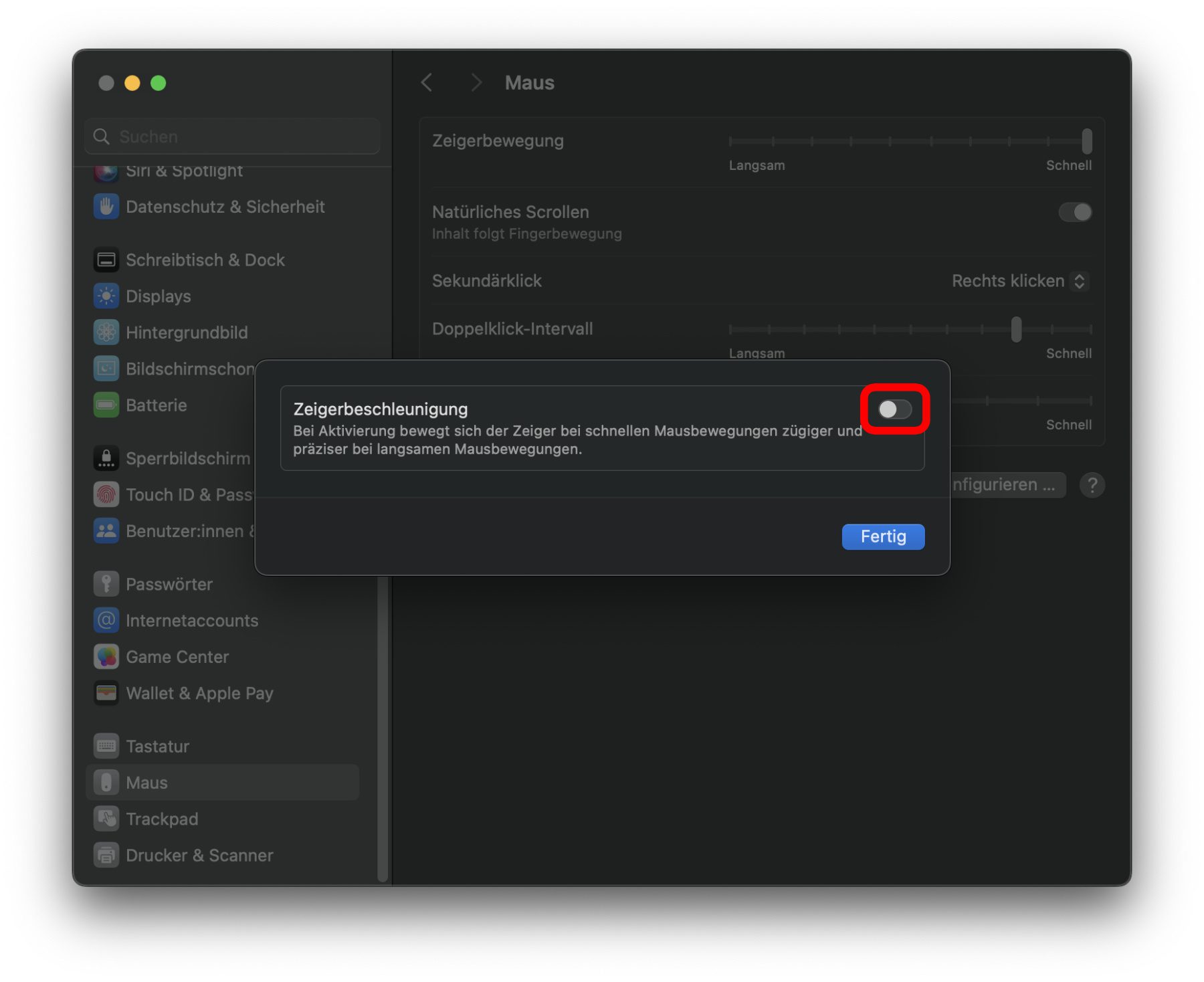 Ab macOS Sonoma: Mausbeschleunigung in den Systemeinstellungen deaktivieren