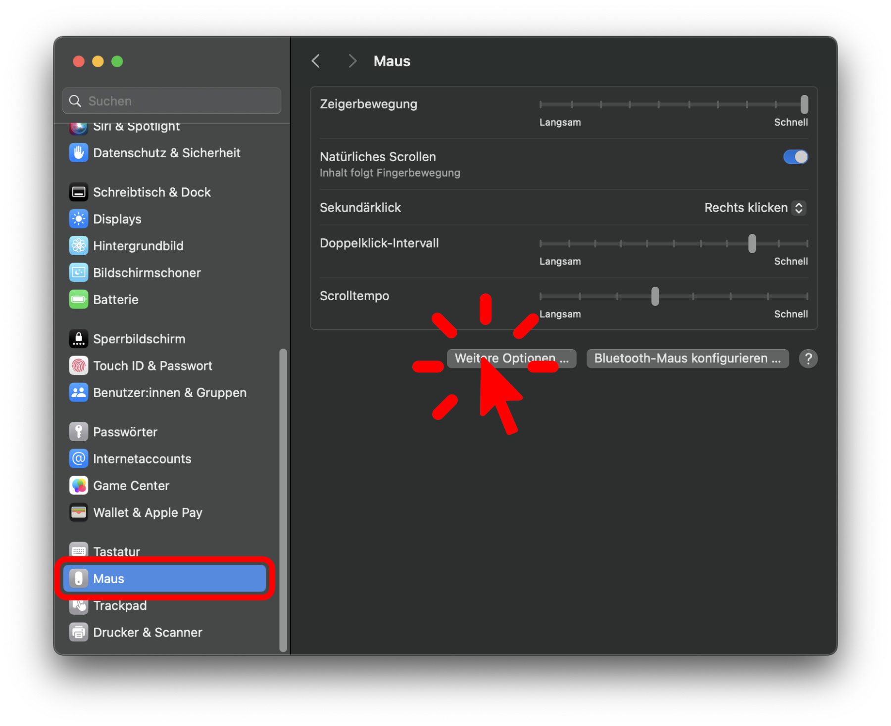 - In der Liste der Einstellungen (links) wählt ihr im untersten Bereich Maus aus