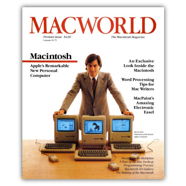 „Macworld, The Macintosh Magazine“ kam in Nordamerika im April 1984 auf den Markt, nur drei Monate nachdem der erste Apple Macintosh vorgestellt wurde. Auf dem Cover der ersten Ausgabe sieht man Steve Jobs hinter drei Macintosh-Computern, auf deren Bildschirmen jeweils ein paar Nutzungsbeispiele zu sehen sind. Dabei ist mittig MacPaint mit einem Vorschaubild des Programms zu sehen. Im Heft selbst gibt es eine Einführung ins System, einen Beitrag zur Maus und ihrer Nutzung, Details zu verschiedenen Programmen, ein zehnseitiges Making-Of des Macintosh und mehr. Insgesamt gibt es über 140 Seiten zu entdecken.