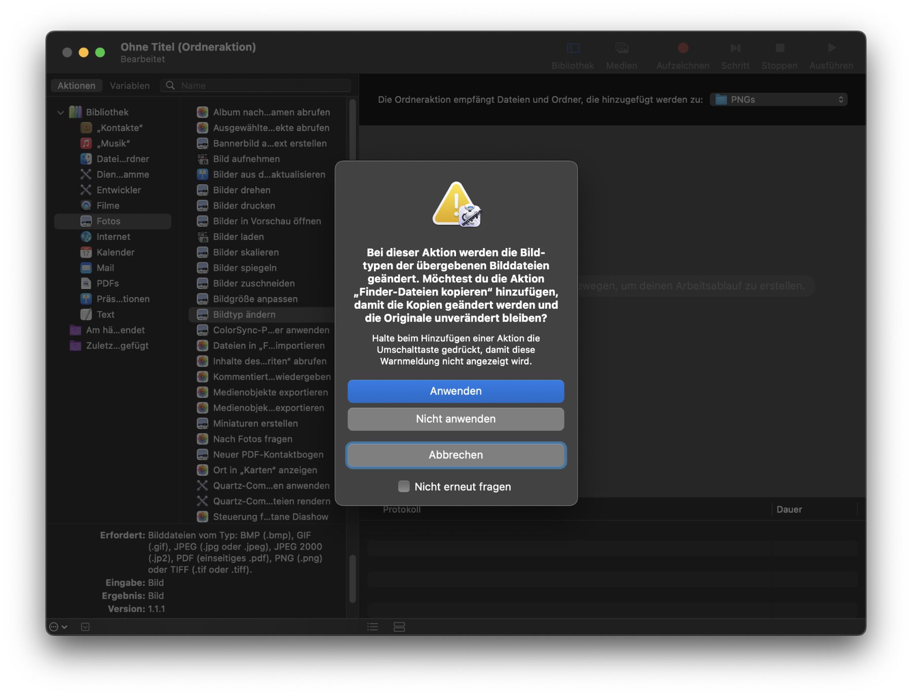 - Es erscheint ein Hinweisfenster – „Anwenden“ bedeutet, dass neben der konvertierten Bilddatei auch das Original im anderen Format behalten wird. „Nicht anwenden“ bedeutet, dass die Originaldatei nicht behalten wird.