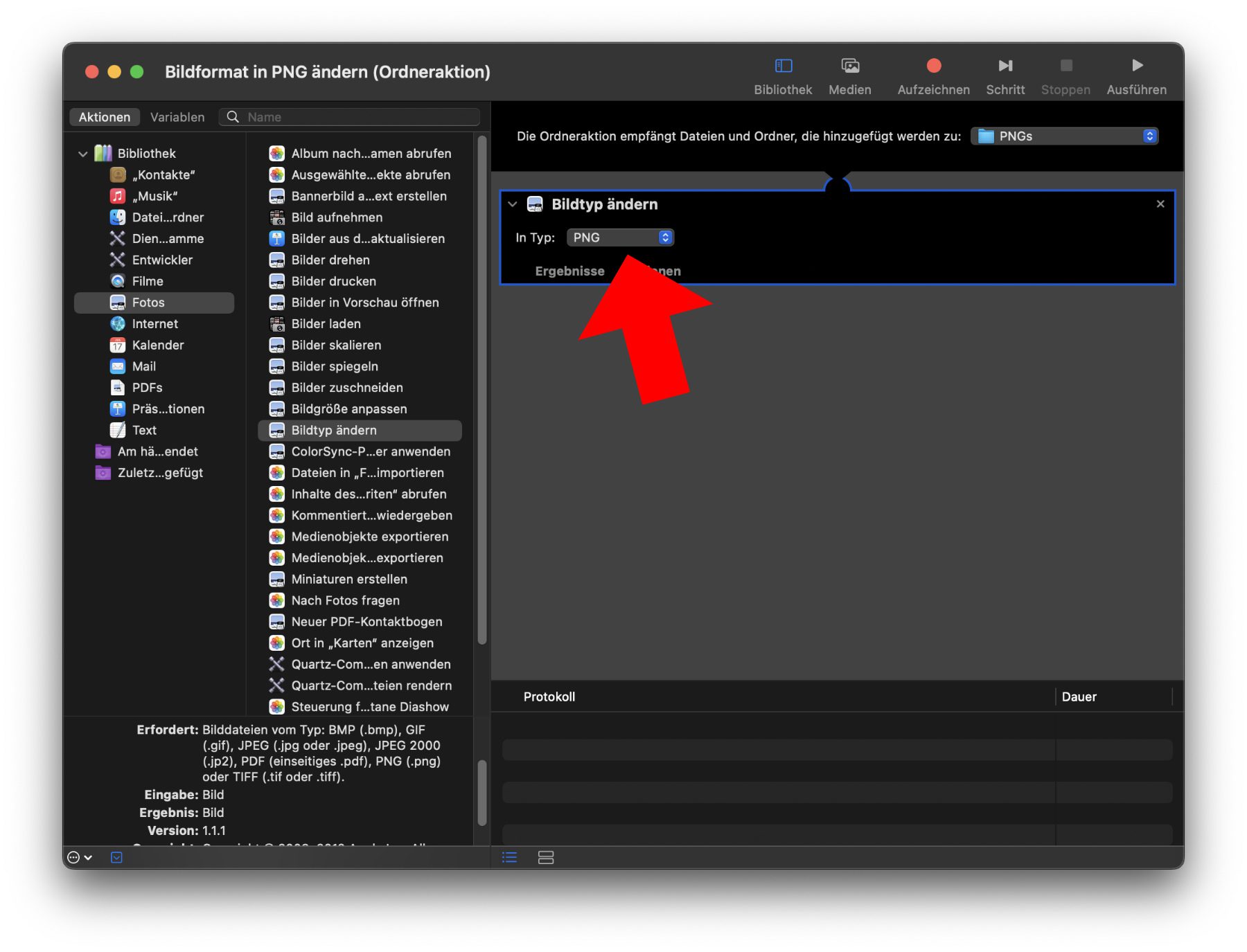 - Unter „Bildtyp ändern“ wird das Ziel-Format für die Dateien festgelegt, die in den Ordner verschoben werden (in meinem Beispiel PNG).