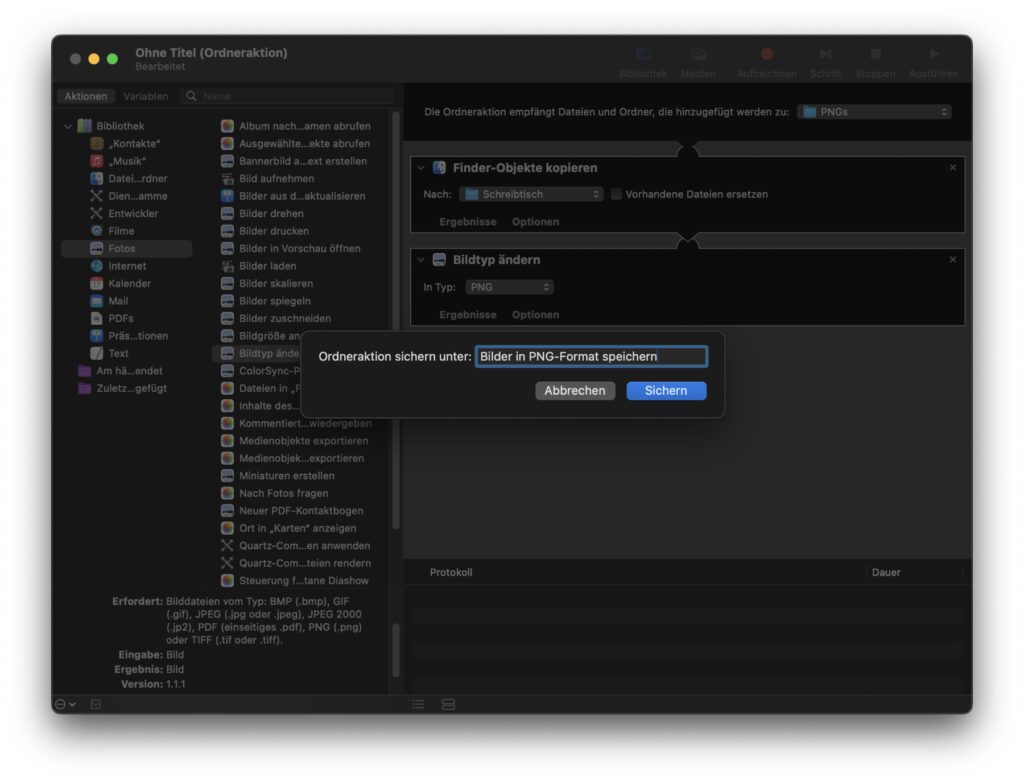 - Als letztes in der Menüleiste unter Ablage -> Sichern… die Automation speichern (am besten einen Namen dafür auswählen, der erkennbar macht, was die Automation macht).