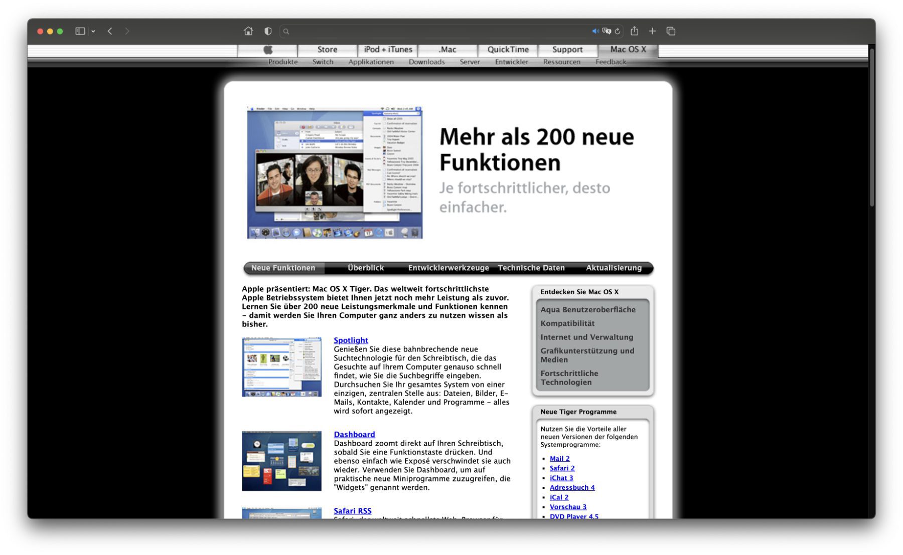 Damit aber nicht genug, denn auch QuickTime 7 gehörte zu den Neuerungen in Mac OS X Tiger. Damit wurde z. B. die Wiedergabe von H.264 Video möglich. Die eigenen Filme mit der neuen Software aufzuzeichnen, das wurde dank dem Update auf QuickTime 7 Pro möglich. Die eigenen Filme konnten dann auch mit anderen übers Internet geteilt werden. Apropos: Mit „.Mac Sync“ wurde eine neue Funktion für das damals noch genutzte .Mac-Angebot implementiert. Damit sollte die Synchronisierung der Programme und Macs im eigenen Netzwerk leichter fallen. Und für Familien mit einem oder mehreren Macs im Haushalt wurde die neue Kindersicherung eingeführt – mit der steigenden Popularität des Internets sicher eine gute Idee.