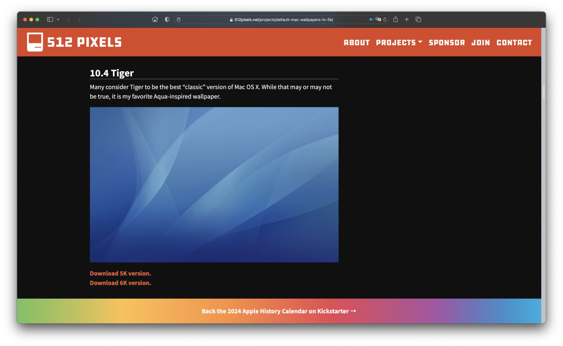 Zur 512pixels-Seite mit allen Download-Optionen kommt ihr mit diesem Link. Ihr könnt euch dort durch die Mac-Wallpaper der letzten Jahrzehnte scrollen und das passende in hoher Auflösung herunterladen. Sie sehen damit auch auf modernen 5K- und 6K-Displays gut aus. Auf der 512pixels-Webseite findet ihr neben der Sammlung von Mac-Hintergrundbildern außerdem noch andere spannende Projekte für Apple-Fans: Screenshots alter Betriebssysteme und Apps, den Apple History Kalender, die DogCow-Geschichte und noch mehr rund um Apple und den Mac-Computer. Das ist auf jeden Fall einen Blick wert, wenn man in Erinnerungen oder Nostalgie schwelgen will.