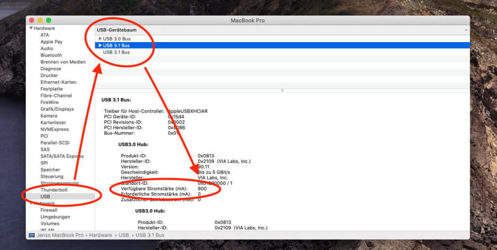 Bei mir sieht man dort den USB 3.1 Bus, den man auswählen kann, um dann unter der Eintragung "Verfügbare Stromstärke" die maximale Stromstärke zu ermitteln, die ein externes USB-Gerät ohne eigene Stromversorgung haben darf. In meinem Fall sind dies 900 mA.