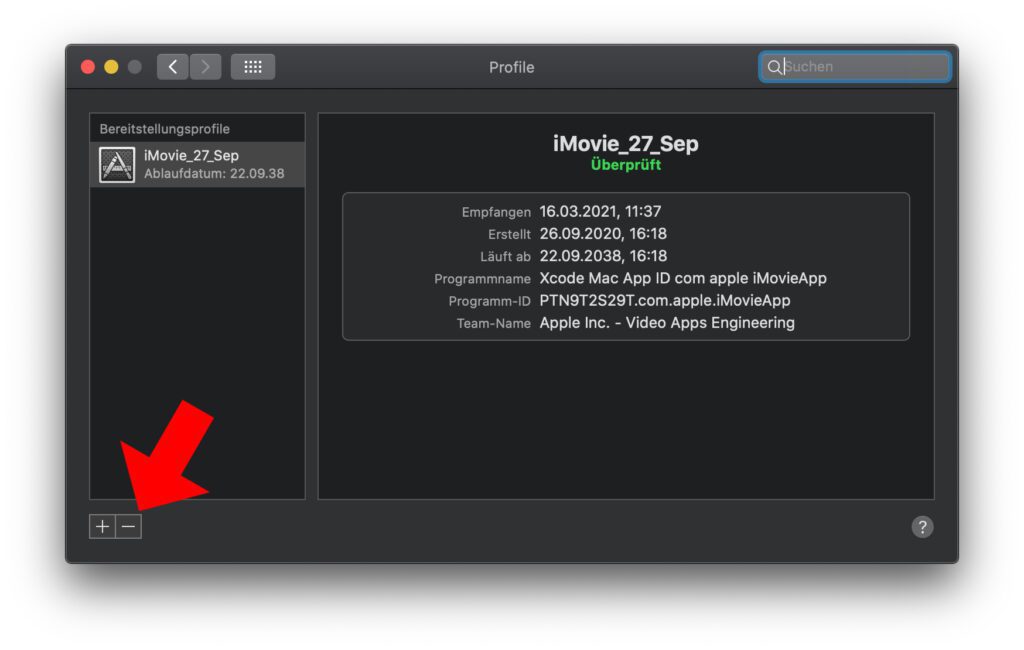 Klickt ihr in den Mac Systemeinstellungen auf „Profile“, dann seht ihr in der linken Liste unter der Überschrift „Bereitstellungsprofile“ den Namen iMovie_27_Sep. Wahrscheinlich mit einem abgewandelten App-Store-Symbol und dem Ablaufdatum 22.09.38. Das Profil soll in 2020 erstellt worden sein und im März 2021 von eurem Mac empfangen. Der Programmname, der damit verbunden ist, lautet Xcode Mac App ID comapple iMovieApp. Und das gibt auch schon den Hinweis auf die Herkunft des Profils.