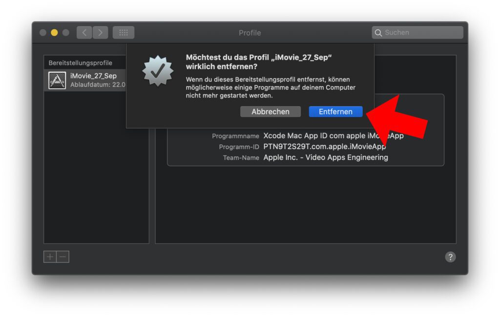 Wenn ihr also kein/e Developer/in seid, dann könnt ihr iMovie_27_Sep ganz einfach von eurem Mac entfernen. Um das Bereitstellungsprofil zu löschen, wählt ihr es unter Mac-Menü -> Systemeinstellungen… -> Profile aus, klickt unter der Liste auf das Minus-Symbol und bestätigt euer Vorhaben mit dem Entfernen-Button. Dann müsst ihr wahrscheinlich noch euer Passwort eingeben, dieses bestätigen, und schon ist das Profil weg. Habt ihr kein anderes, dann verschwindet auch die entsprechende Auswahl in den Systemeinstellungen.