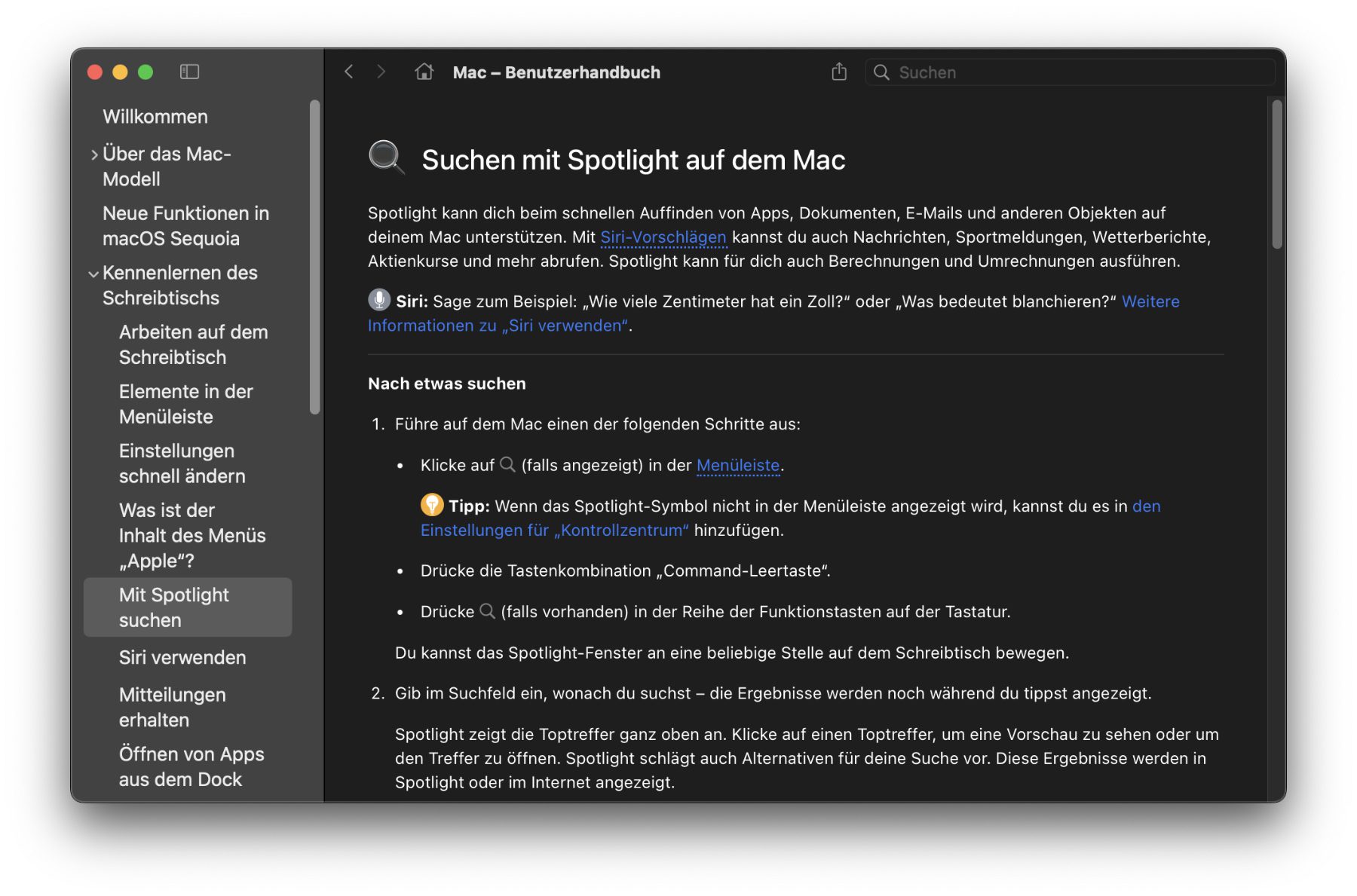 Wurde Spotlight (etwa über command+Leertaste) geöffnet, dann muss nur noch command+H gedrückt werden, um weitere Anleitungen und Ratgeber dazu aufzurufen. Denn diese Tastenkombi öffnet die Tipps App, welche neben der macOS-Suche auch noch zahlreiche andere Themen des Mac behandelt. Durch das Aufrufen über das Suchfeld wird aber direkt die Seite „Suchen mit Spotlight auf dem Mac“ geöffnet.